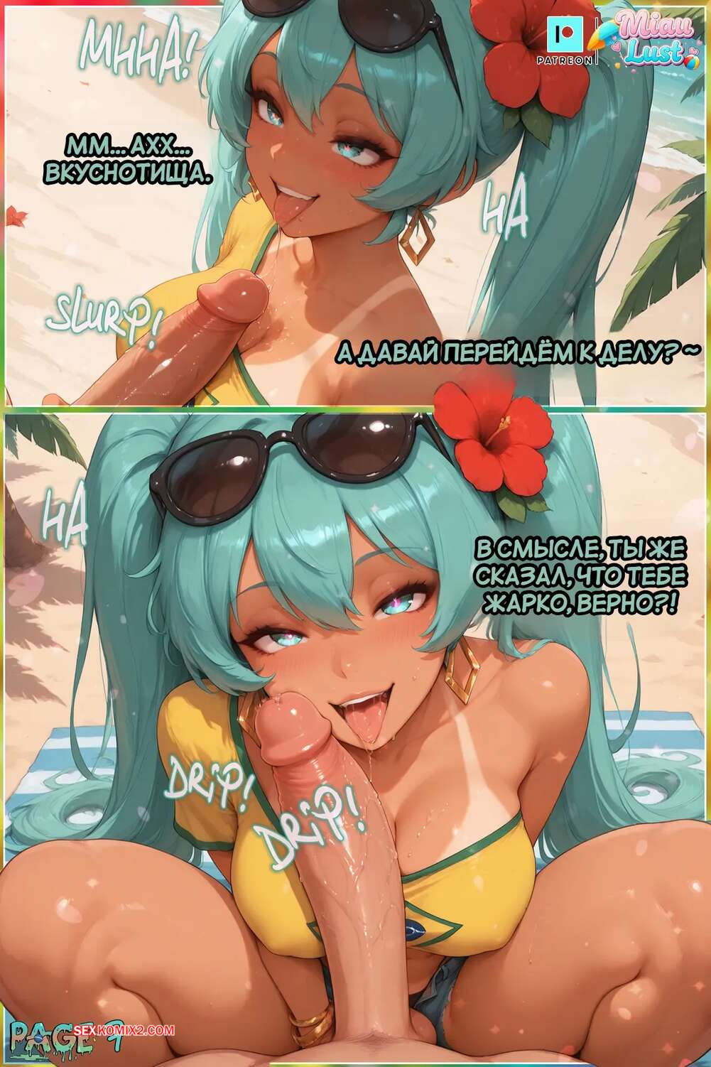 Порно комикс Тепловой удар. Heat Stroke. MiauLust. Красотка Мику пришла на пляж, где положила глаз на симпатичного парня. Девушка стала с ним заигрывать и отсосала хуец парня, после чего оседлала его и дала себя выебать.
